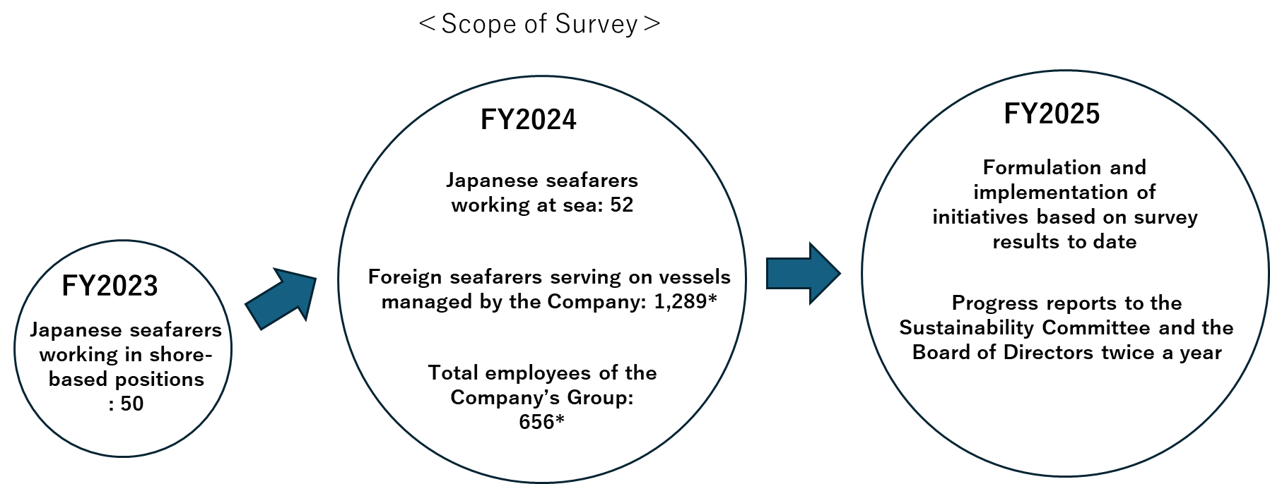 In order to assess the effectiveness of these initiatives and link them to further improvements, we conduct an engagement survey for non‑Japanese seafarers assigned to vessels under our management. This survey incorporates the items of the industry-wide Seafarers Happiness Index, supplemented by original questions developed by us. For Japanese seafarers, we conduct an employee awareness survey. The results of these surveys are utilized to improve our initiatives and to develop more effective measures.